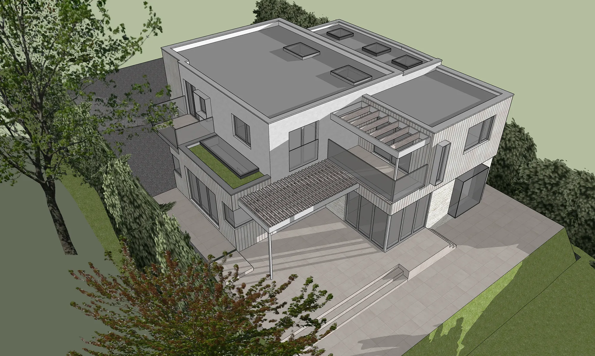 The project is currently at RIBA Stage 2 (Concept Design), with photorealistic renders in progress. Budgeted at £400–500k, the builder-client plans to execute the work using sustainable methods such as timber framing or SIP panels. This will ensure the redesign harmonises with its surroundings and achieves a striking yet contextually sensitive aesthetic.